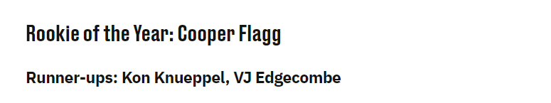 最佳新秀弗拉格。这个奖项的竞争非常激烈,克努佩尔与弗拉格都是热门候选人,弗拉格所在的独行侠是摆烂球队,克努佩尔的黄蜂则是附加赛球队,但弗拉格的数据比克努佩尔更出色更全面。