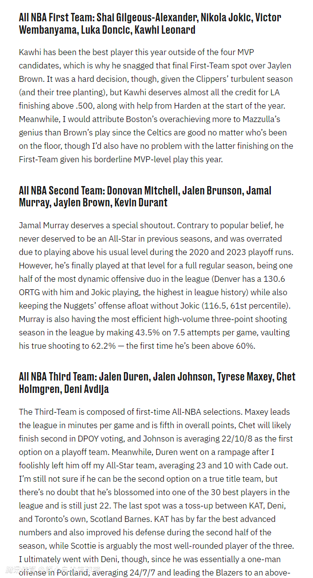 最佳三阵:马克西、阿夫迪亚、杜伦、杰伦-约翰逊、霍姆格伦;
