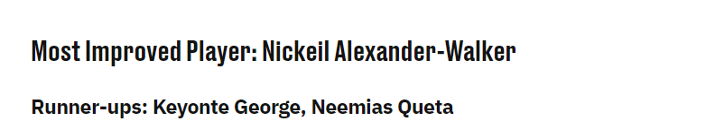 最快进步球员亚历山大-沃克。从森林狼到老鹰,沃克的数据有着质的提升,场均9.4分提升到20.8分,真实命中率60.4%也远高于他生涯平均的55.1%,沃克未来甚至有希望进入全明星。