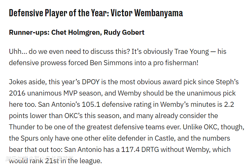 DPOY就是文班亚马,他有可能是NBA历史上第一个全票DPOY,马刺队没有一个精英级的外线防守者,所以文班亚马在篮下的护框更为重要,他让对手命中率仅为31.7%。