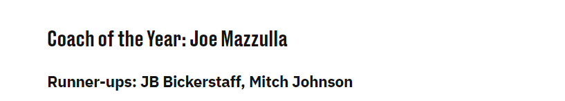 最佳教练乔-马祖拉,本赛季在塔图姆伤停了大半赛季的情况下,马祖拉依旧帮助凯尔特人拿到56胜东部第二,马祖拉所建立的体系与战略非常出色。