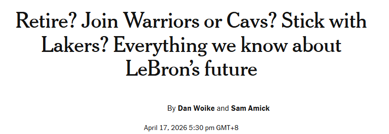 2026-04-17 19:40北京时间4月17日,据The Athletic报道,多位获准匿名受访的球队及联盟消息人士透露:詹姆斯目前尚未对未来做出任何决定,退役依然是切实存在的选项。