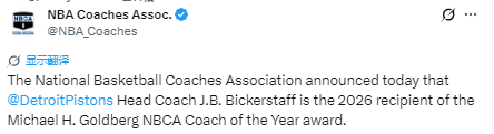 2026-04-18 00:00北京时间4月17日,美国国家篮球教练协会(NBCA)官方宣布,底特律活塞队主教练比克斯塔夫当选该协会评选的年度最佳教练。