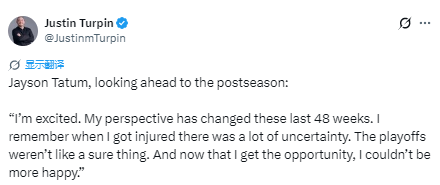 塔图姆在展望季后赛时说道:“我很兴奋。过去这48周里,我的心态发生了变化。我还记得自己受伤那会儿,一切都充满了不确定性,能否打进季后赛都还是个未知数。而现在我获得了这样的机会,我感到无比开心。”