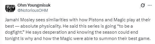 在接受采访前,莫斯利先感谢了奥兰多当地球迷,并将主场球馆内热烈的氛围,列为魔术队击败黄蜂队的关键原因之一。随后,莫斯利谈到了魔术队取胜的原因:“防守、防守。我们防住了对手,提前卡位顶住对方小个子后卫,沉下重心防守,完成抢断和制造失误,才能推起转换进攻。”