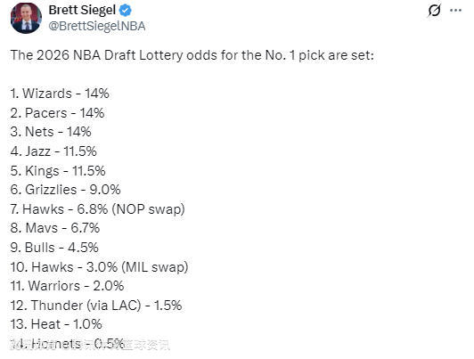 目前参加乐透抽签的14支球队已经全部出炉,抽中状元签的概率如下: