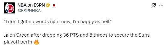 2026-04-18 14:10北京时间4月18日,NBA附加赛继续进行,勇士队96-111不敌太阳队。此役,杰伦-格林轰下36分6篮板4助攻2抢断3盖帽,赛后,他接受媒体采访。
