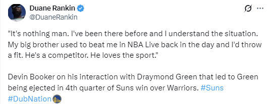 布克表示:“没事的兄弟。我以前也经历过这种场面,我懂这种处境。以前我大哥玩NBA游戏总赢我,我都会当场发脾气。格林就是个好胜的人,他热爱这项运动。”