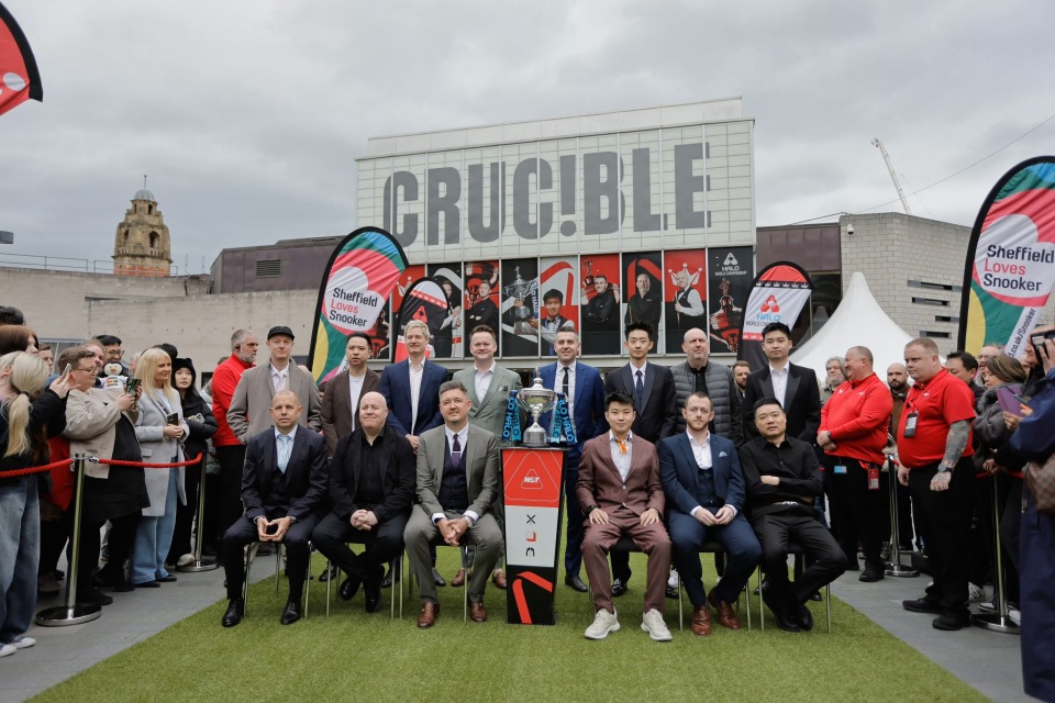 2026-04-18 17:002026年斯诺克世锦赛媒体日,TOP16种子选手在英国谢菲尔德克鲁斯堡剧院外合影。卫冕冠军赵心童在C位,西装革履英姿勃发,中国5将同框。奥沙利文和特鲁姆普缺席,主办方对其的罚款数额引发争议。