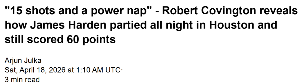 2026-04-18 22:30北京时间4月18日,前火箭球员罗伯特-考文顿,在最新的一期播客节目上谈到了前队友哈登的疯狂夜生活和训练。