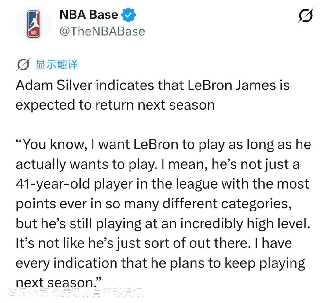萧华:你知道,我当然希望詹姆斯留下。只要他自己还想打,就一直打下去。他不只是联盟里一个41岁的球员——他是历史得分王,在一大堆数据榜单上都名列前茅,而且他依然保持着极高的竞技水准,不是随便在场上混混的那种。从各方面迹象来看,他计划下赛季继续征战。