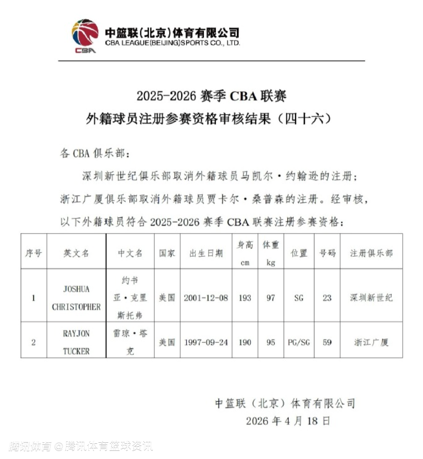 2026-04-18 23:40北京时间4月18日,CBA官网更新了外援注册信息,深圳男篮取消马凯尔-约翰逊注册,为克里斯托弗完成注册,他将身披23号球衣,另外广厦男篮取消了桑普森注册,重新注册塔克。