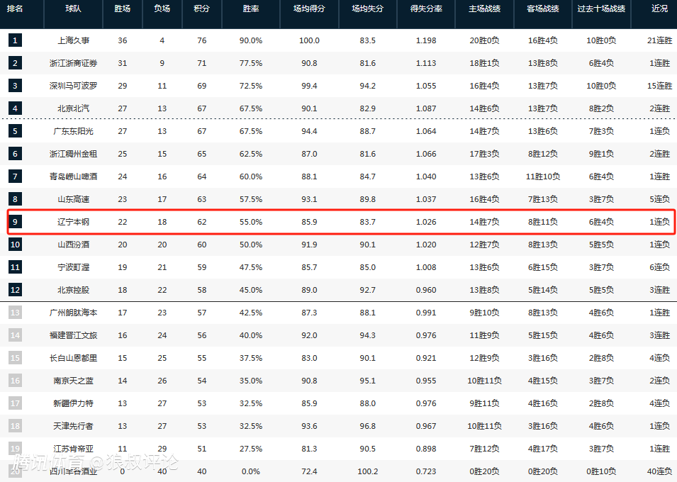 此役过后,辽宁男篮的战绩为22胜18负,排在积分榜第九。
