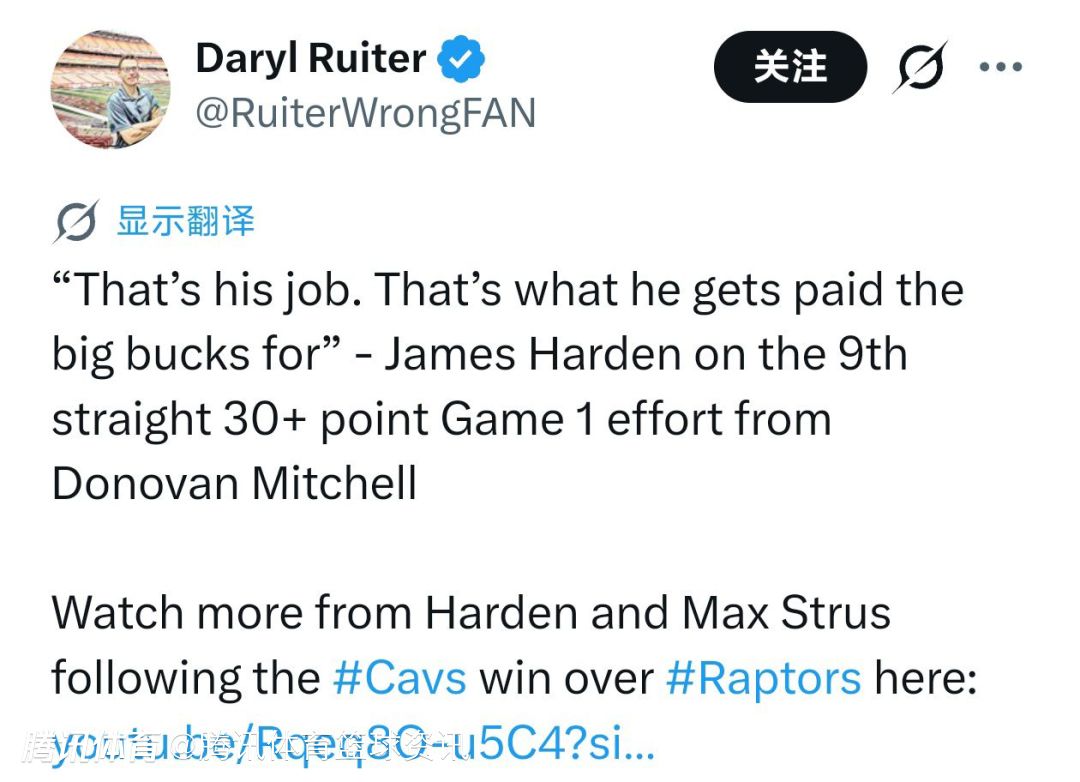 关于队友米切尔连续9个系列赛G1砍30+的表现,哈登说道:“拿高薪就是干这个的,对吧?打得有侵略性、出手投篮、做他该做的事。我们都明白这一点。所以我们的任务就是上场做好自己的角色,用其他方式影响比赛。”
