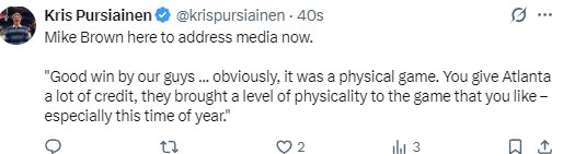 在谈到米切尔-罗宾逊被“砍杀”的话题时,布朗表示:“我们会看比赛的具体情况,只要觉得还没到必须换人,就会让他继续留在场上。一旦我们感觉该换人了,就会换。我们会给他机会。”