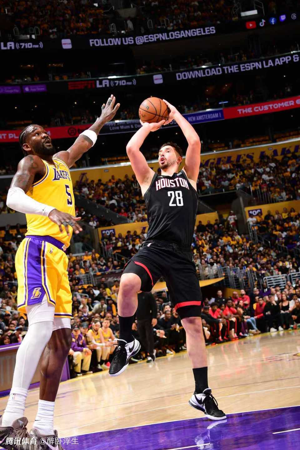 湖人半场仅领先火箭2分:詹姆斯6+10助攻 艾顿5中5申京11分