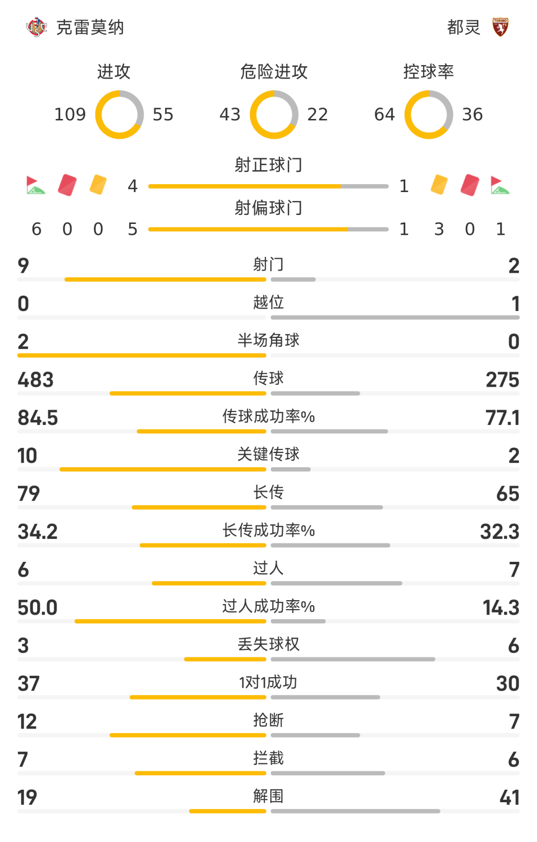 2026-04-19 20:3025/26赛季意甲联赛第33轮,克雷莫纳0-0互交白卷闷平都灵。