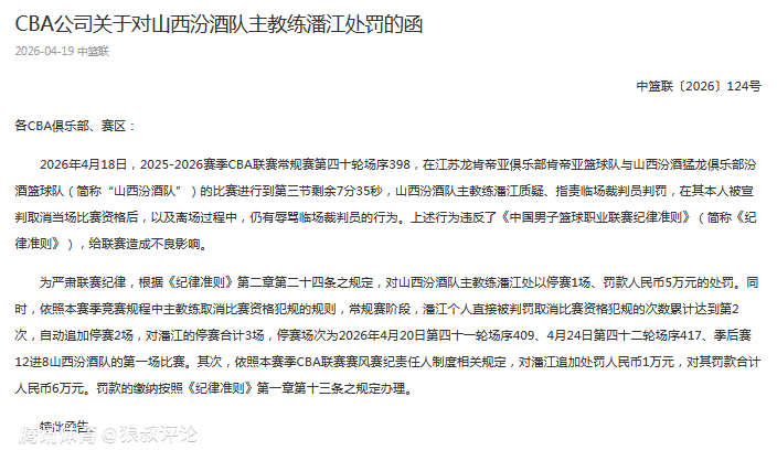 2026-04-19 21:00北京时间4月19日,根据CBA官方公示,山西男篮主帅潘江在对阵江苏男篮的比赛当中,第三节吃到技术犯规取消当场比赛资格后,以及离场过程中,仍有辱骂临场裁判员的行为。累计罚款6万,以及停赛3场处罚。