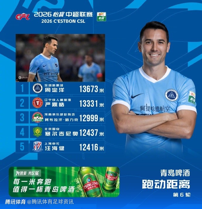 2026-04-19 22:00北京时间4月19日,中超联赛官方公布第6轮球员跑动距离榜单。在本轮高强度对抗中,周定洋以13673米的跑动数据位列第一,展现出极强的覆盖能力与比赛投入度。
