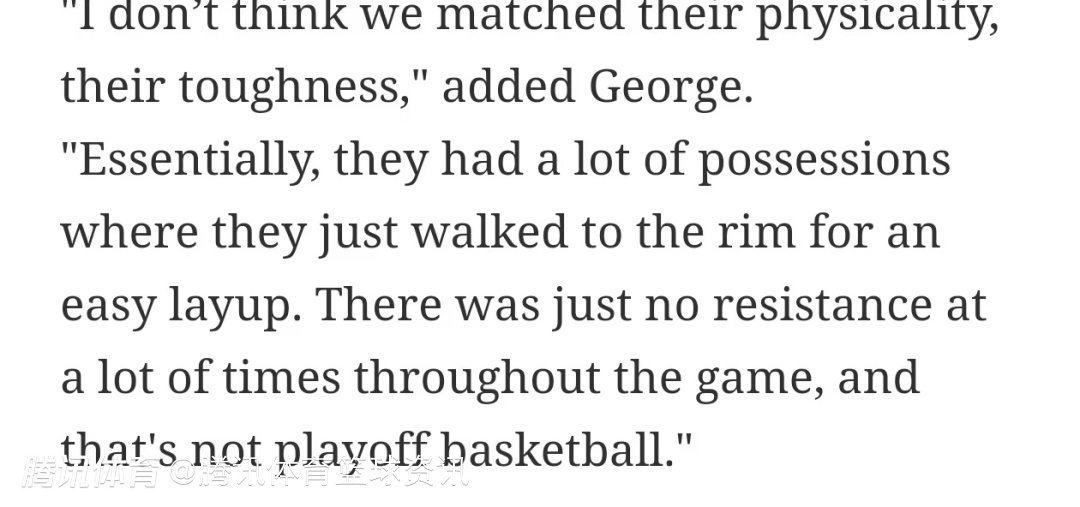 乔治表示:“我认为我们没有匹配上他们的身体对抗和强硬程度。很多回合里,他们几乎可以轻松杀到篮下完成上篮。比赛大部分时间里我们都没有给出足够的抵抗,这根本不是季后赛该有的样子。”