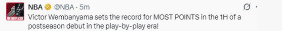 季后赛首秀上半场21分!文班超欧文詹宁斯 创NBA实况转播时代新纪录