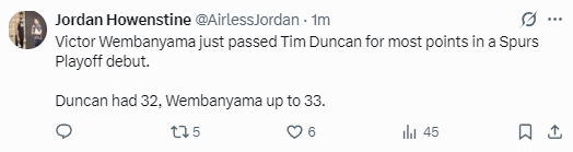 此役,文班亚马在上半场砍下21分,超越欧文和詹宁斯,创造NBA实况转播时代(1997-98赛季)季后赛首秀上半场得分最高纪录。在第三节比赛中,文班亚马一度收敛个人进攻,但在末节他却再次爆发,并在末节比赛结束前5分34秒投中一记三分球,拿到个人第33分,完成了对邓肯的超越。