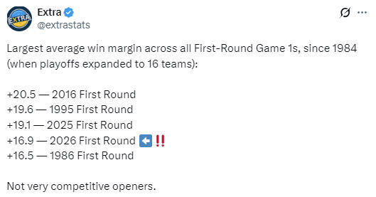 2026-04-20 12:20北京时间4月20日,NBA季后赛首轮G1的比赛全部战罢,场均分差为16.9分,创NBA历史季后赛首轮G1第四高分差。
