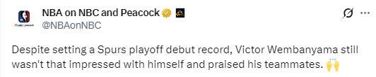 在谈到自己砍下35分的表现时,文班亚马说道:“说实话,这没什么大不了的。这场球真的体现出了我们球队的精神面貌。”