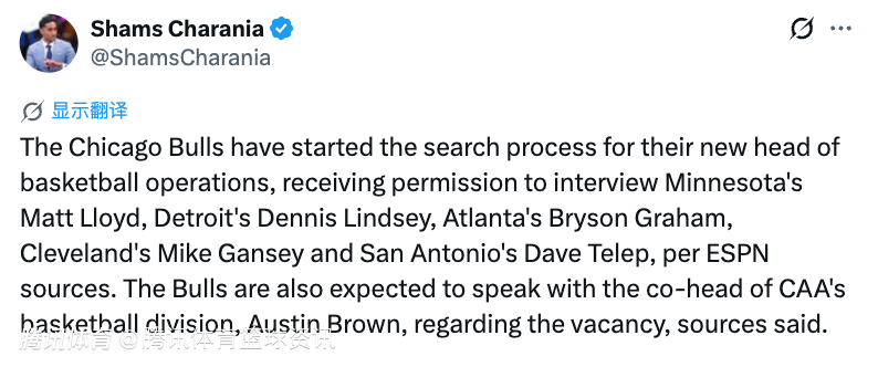 消息源还表示,公牛队预计也将与CAA篮球部门联合主管奥斯汀-布朗就该职位空缺进行沟通。