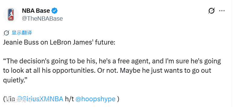 2026-04-20 23:20北京时间4月20日,前湖人老板,现湖人股东珍妮-巴斯在电台节目上被问及詹姆斯的未来,她也做出了明确的回应。
