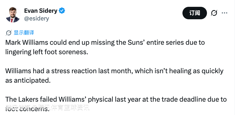 马威上个月出现了左脚第三跖骨应激反应,当时太阳官方宣布他将在2-3周后接受复查,但如今恢复进度比预期慢。去年交易截止日,湖人就因足部健康问题,未能通过他的体检,导致交易告吹。