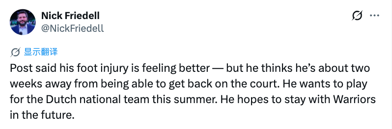 波斯特表示,他原本希望如果勇士打进季后赛,自己能从右脚酸痛中的伤病中恢复,并且复出,但强行带伤作战让伤势加重了,他预计自己还需要两周左右才能重返赛场,并且计划在今年夏天为荷兰国家队出战,同时也希望在即将到来的自由球员市场中留在勇士队。
