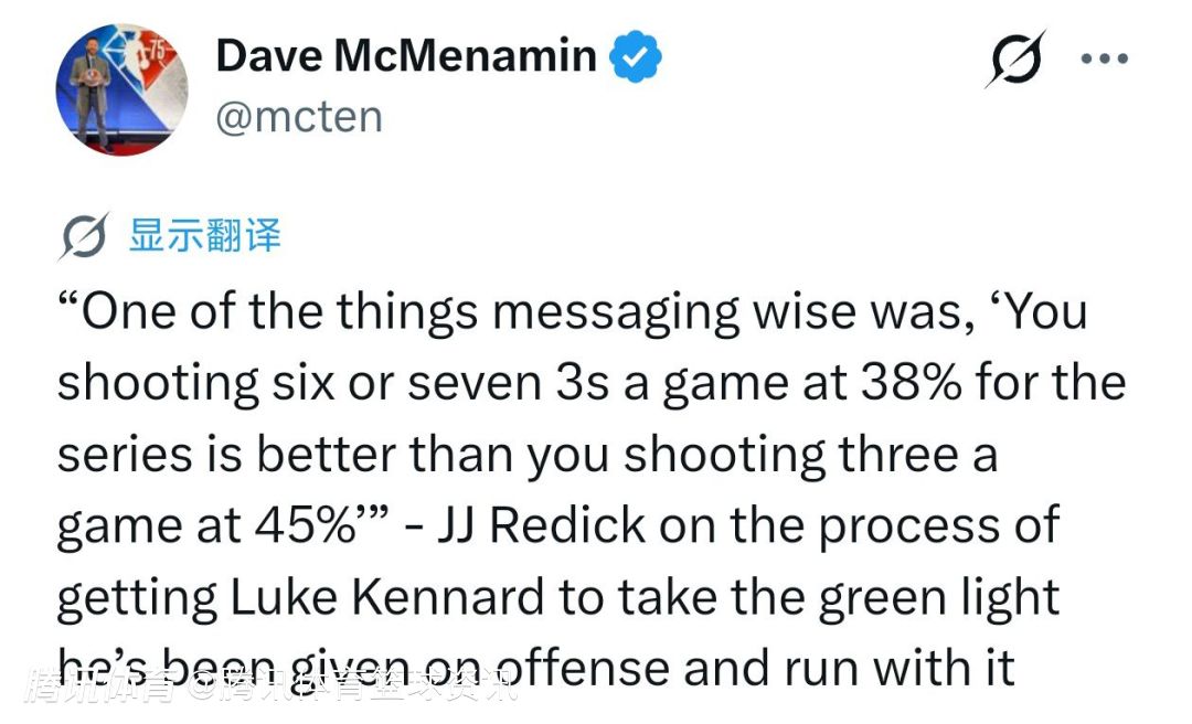 关于肯纳德的战术安排,雷迪克说道:“我们一直在聊这件事。我觉得从战术沟通层面来说,有一点很关键:你这轮系列赛场均投六七个三分,命中率38%,远比场均只投三个、命中率45%要更有价值。我们就是需要你出手。他不可能每场都5投5 中,但我很喜欢他这种侵略性。下半场有两个球,我看他本来有机会出手却传了,其实他完全可以直接快速出手。”