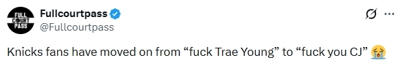 在双方的首回合比赛中,CJ-麦科勒姆曾经在后仰跳投时伸脚踢到布伦森的要害部位,导致自己被吹技术犯规。赛后他还指责布伦森演戏,此事也惹恼了很多尼克斯球迷。这次他又与阿尔瓦拉多冲突,导致尼克斯主场狂嘘,甚至纽约球迷的口号已从“法克吹杨”变成了“法克CJ”。