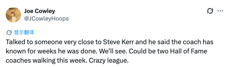 2026-04-21 11:50北京时间4月21日,据美记Joe Cowley报道,一位跟科尔关系非常近的人透露,他说科尔几周前就已经知道自己在勇士的执教生涯要结束了,另外他也表示这周可能会有两位名人堂级别的教练离开岗位。