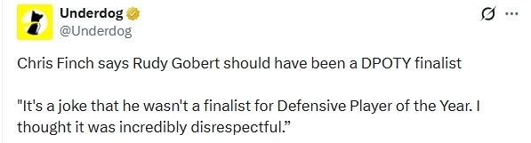 在谈到戈贝尔未能入选最佳防守球员候选名单时,芬奇说道:“他没能入选年度最佳防守球员候选名单,这简直是个笑话,仅凭他一人,就能让球队防守跻身联盟前五。我觉得这是极度不尊重人的做法,大家对戈贝尔的那些评价,既可笑又狭隘、还很小气。”