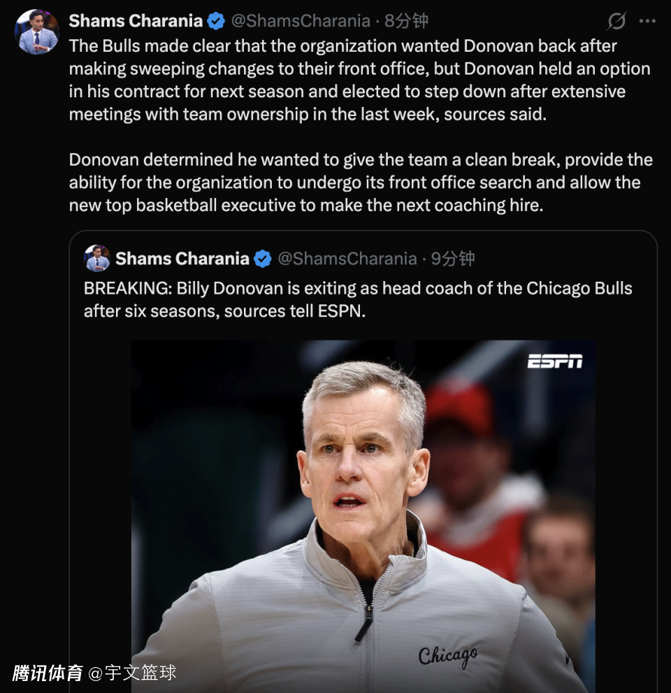 2026-04-21 23:00据名记Shams报道,公牛主教练比利-多诺万已决定在执教公牛6个赛季后离任。