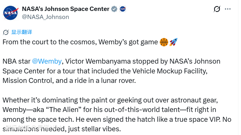 就像NASA发文所述,文班亚马此前就一直关注NASA的航天项目。去年8月,他参观了NASA位于休斯顿的研究中心;本月早些时候,他还向执行阿尔忒弥斯二号环月任务的宇航员们送上了寄语。