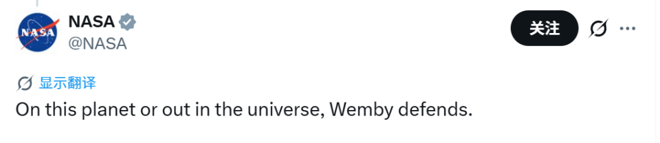 真外星人!NASA祝贺文班:无论地球还是宇宙 他的防守无处不在