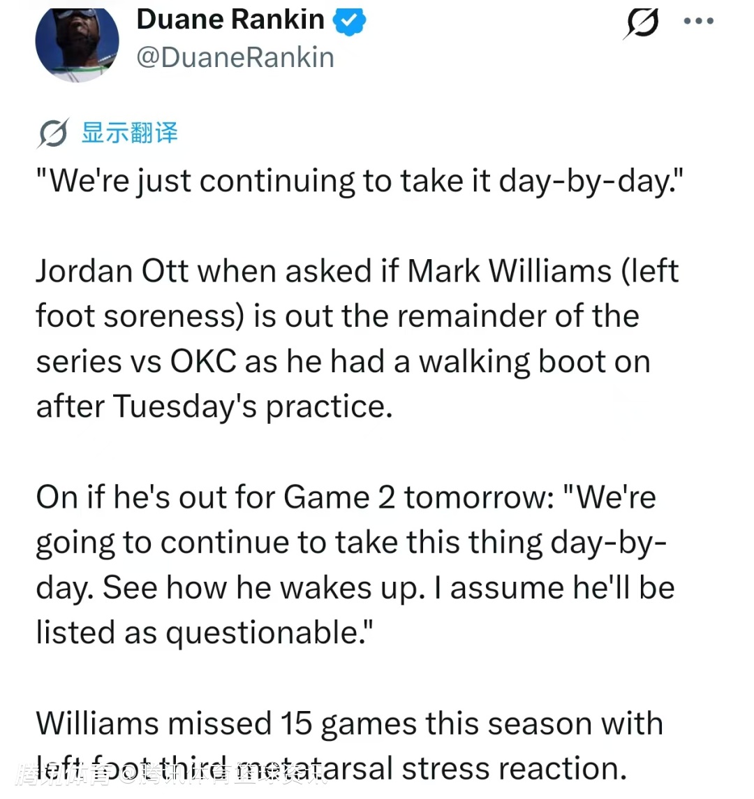 当被问及马克-威廉姆斯(左脚酸痛)在训练后穿上保护靴,是否会缺席对阵雷霆系列赛剩余比赛时,奥特表示:“我们目前只是按天观察情况。我们会继续按天评估,看他睡醒后的身体反应。我预计他会被列入出战成疑名单。”马克-威廉姆斯本赛季曾因左脚第三跖骨应力反应缺席15场比赛。