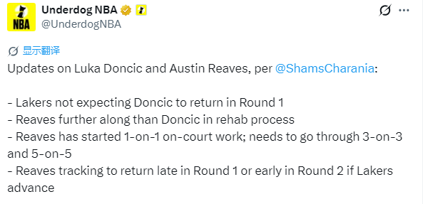 2026-04-22 07:20北京时间4月22日,NBA季后赛火热开打,目前湖人1-0领先火箭,究竟湖人两大核心的伤势康复如何?名记shams报道,东契奇预计首轮报销,里夫斯有望在首轮末期复出。