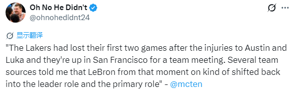 名记Dave McMenamin透露,东契奇和里夫斯受伤后湖人连输两场比赛,湖人在旧金山召开了一个球队会议,来自内部消息源,从那一刻起,詹姆斯基本上重新切换回了领袖角色和头号角色。从那时起,贯穿常规赛结束、附加赛训练期间,一直到季后赛G1,他的语气、专注度和对细节的关注都是‘跟着我,如果你做好你的工作,我就会做好我的工作,我们就有机会赢。’