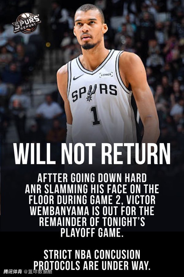 随后,ESPN报道称,文班亚马进入脑震荡保护协议,将缺席G2剩余的比赛,马刺官方也确认了这个消息。