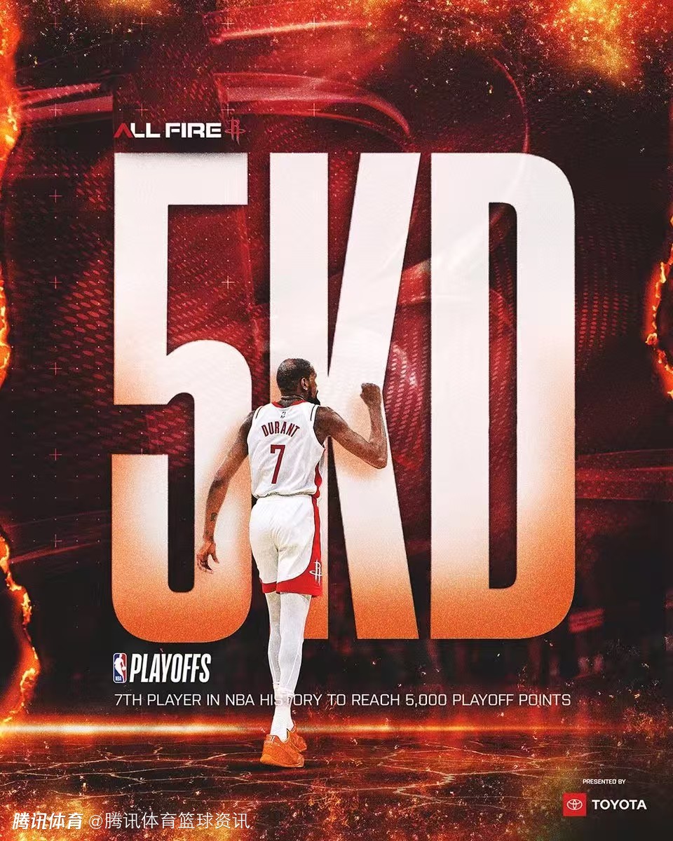 杜兰特在比赛第二节打成一次2+1,就此得到本场第15分,季后赛得分达到5000分里程碑,成为NBA历史上第7位季后赛得分达到5000分的球员。