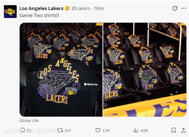 湖人为每一位球迷制作了黑色版球衣的应援T恤。