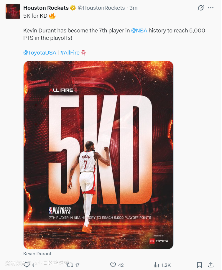 杜兰特完成季后赛5000分里程碑,历史第七位季后赛5000+先生。