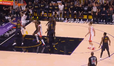 詹姆斯抢断KD传球后快攻暴扣。