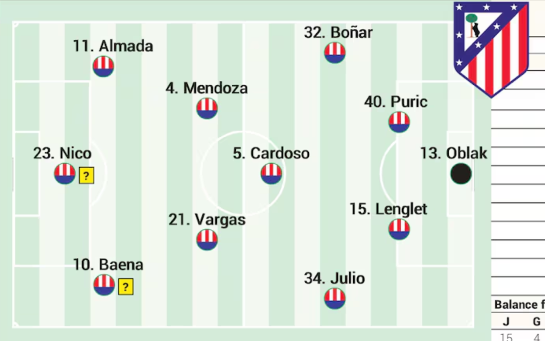 赛前,马竞公布的大名单里,卢克曼、瑟洛特、阿尔瓦雷斯、科克等球员缺席。由于身处魔鬼赛程,由于国王杯决赛消耗过大,也考虑到接下来马竞将在欧冠与阿森纳激战,所以,马竞此战肯定会进行一定幅度的轮换。《阿斯报》预测指出,如塞尔维亚新星普里克,20岁的阿尔马达、瓦尔加斯等人,将可能被委以重任。
