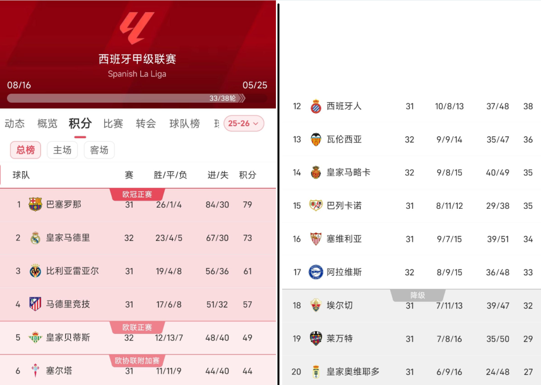 西甲积分榜上,马竞本轮前排名第4,领先第5名多达11分。本轮提前进行的比赛里,贝蒂斯3-2击败赫罗纳,但马竞仍有8分优势,夺取欧冠资格前景明朗。