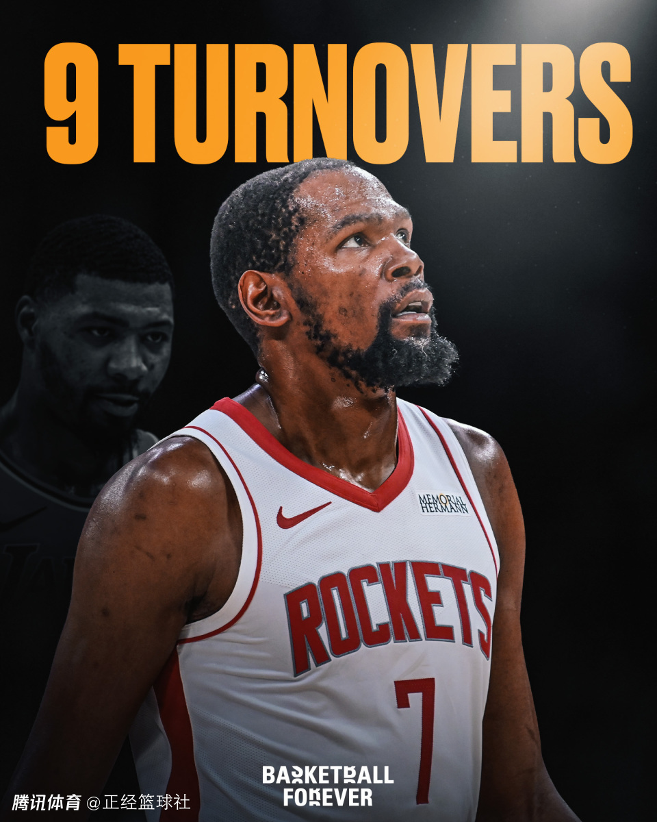 此役,右膝髌腱挫伤未愈的杜兰特选择复出,试图帮助火箭扳平比分。上半场他状态火热,一度高效砍下20分,险些凭借一己之力扭转局势,但下半场被湖人针对性防守限制,仅得3分且失误频发。全场比赛,杜兰特12投7中拿下23分6篮板4助攻,却送出惊人的9次失误,追平其生涯季后赛单场最高纪录,这一数据也成为火箭输球的关键诱因之一。